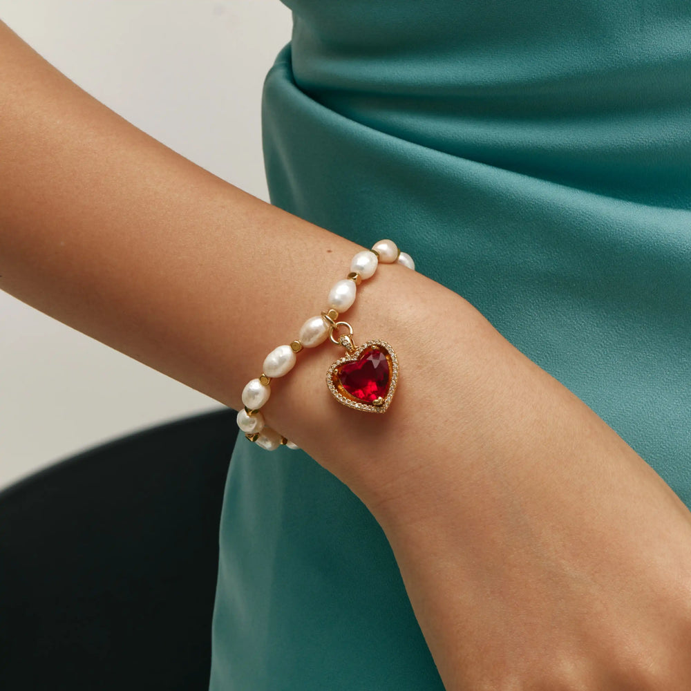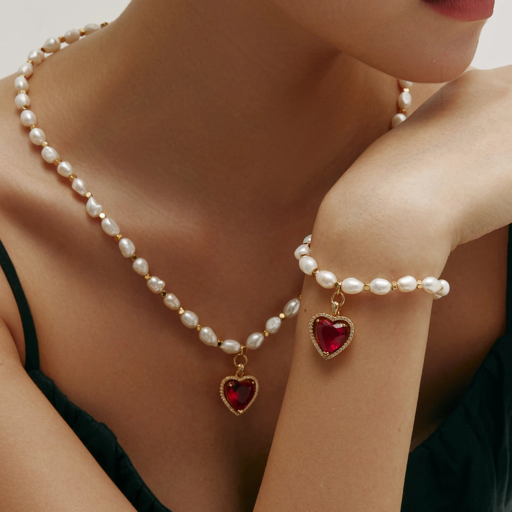 The Amora Duo Set is a tribute to love and elegance. Luminous freshwater pearls are hand-strung and paired with a radiant red heart charm framed in gold. Designed to capture both timeless romance and modern sophistication, this set is perfect for gifting or treasuring as your own everyday luxury.