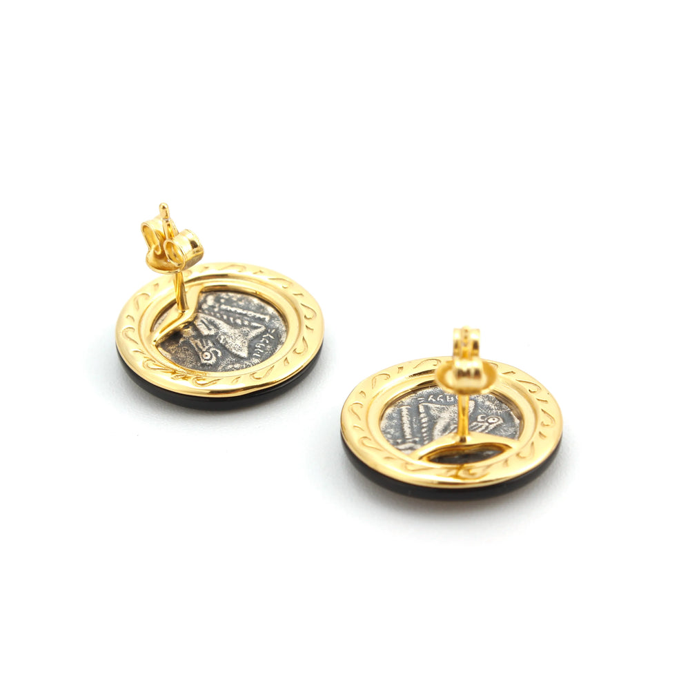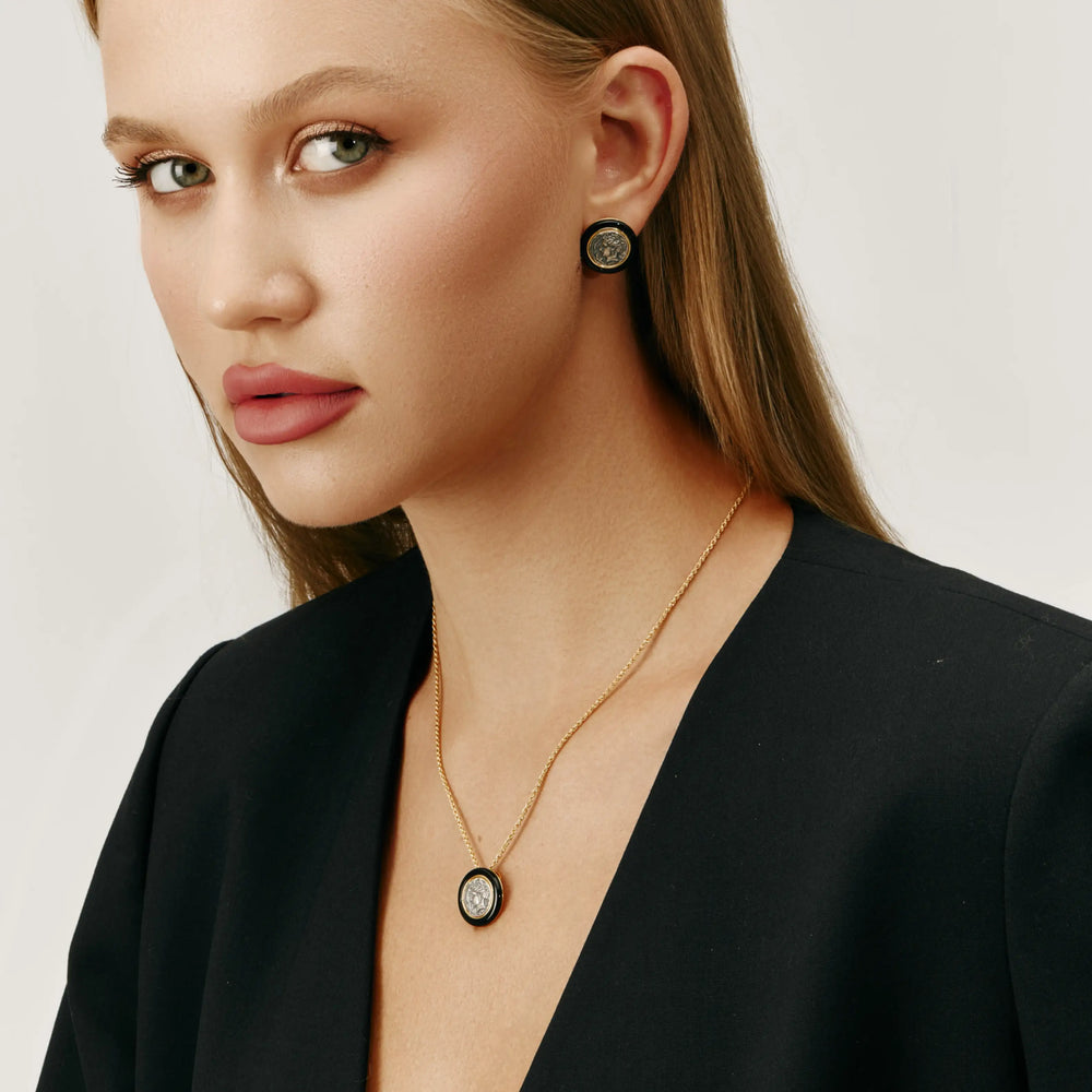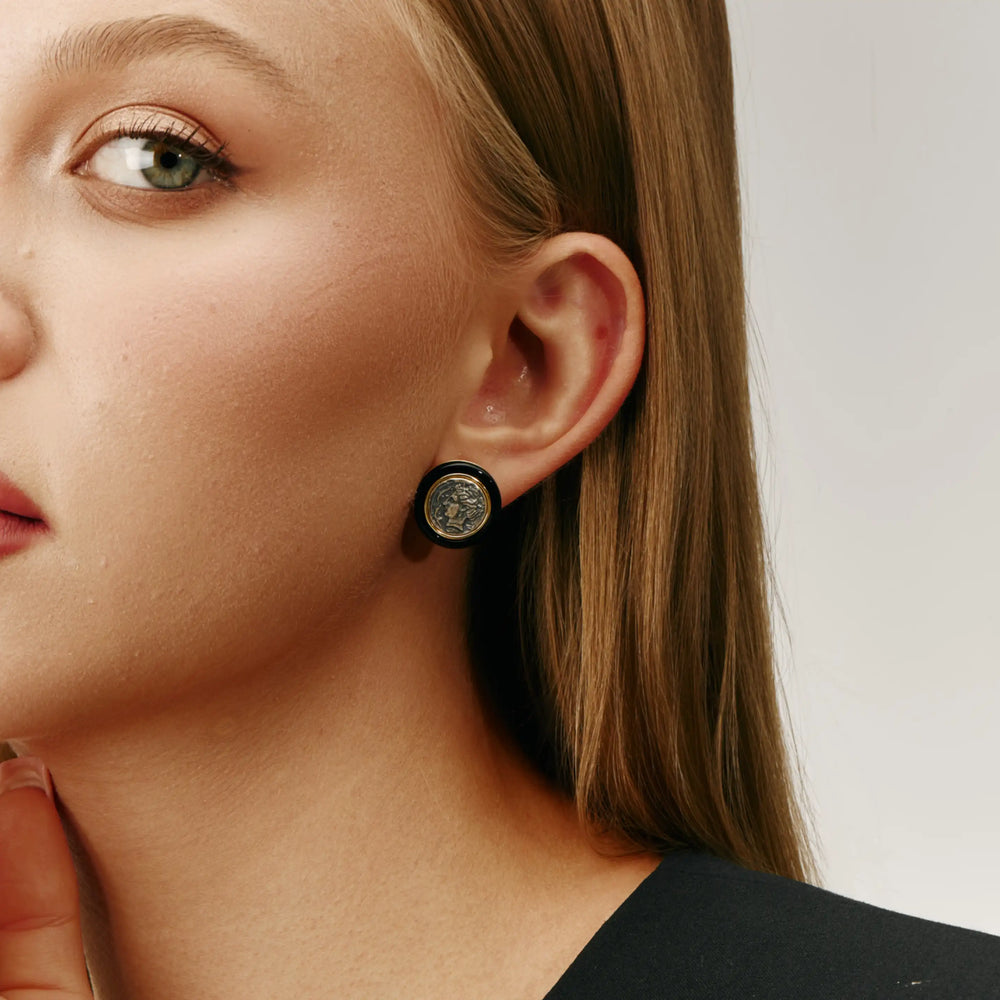 The Astra Earrings bring a touch of antiquity into the modern wardrobe. Featuring vintage-style coin motifs framed in bold black enamel and highlighted with gold accents, they embody strength, elegance, and timeless allure. Pair them with the Astra Necklace for a coordinated look that speaks of heritage and individuality.