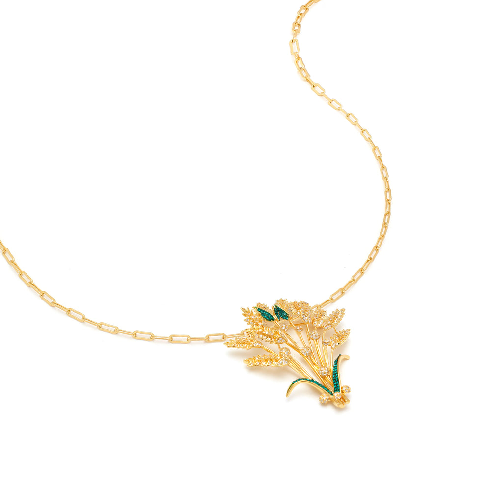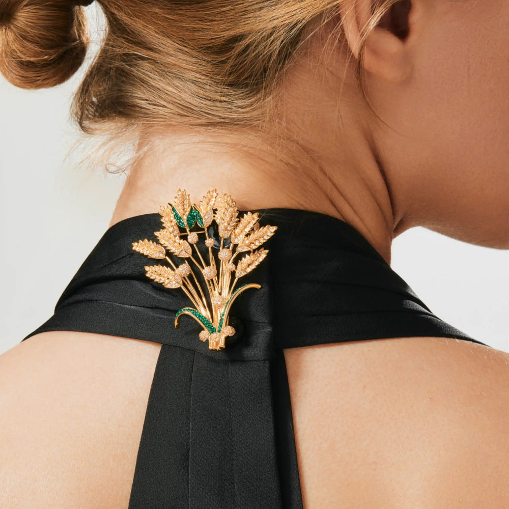 The Aurea Harvest Brooch honors abundance, hope, and the quiet rhythm of life’s growth. Golden stalks rise in delicate arcs, touched with emerald-green accents and crystal brilliance — a symbol of blessings, prosperity, and all the seeds we nurture with patience. Wear it as a charm for new beginnings, graceful progress, and the beauty of seasons turning in your favor.