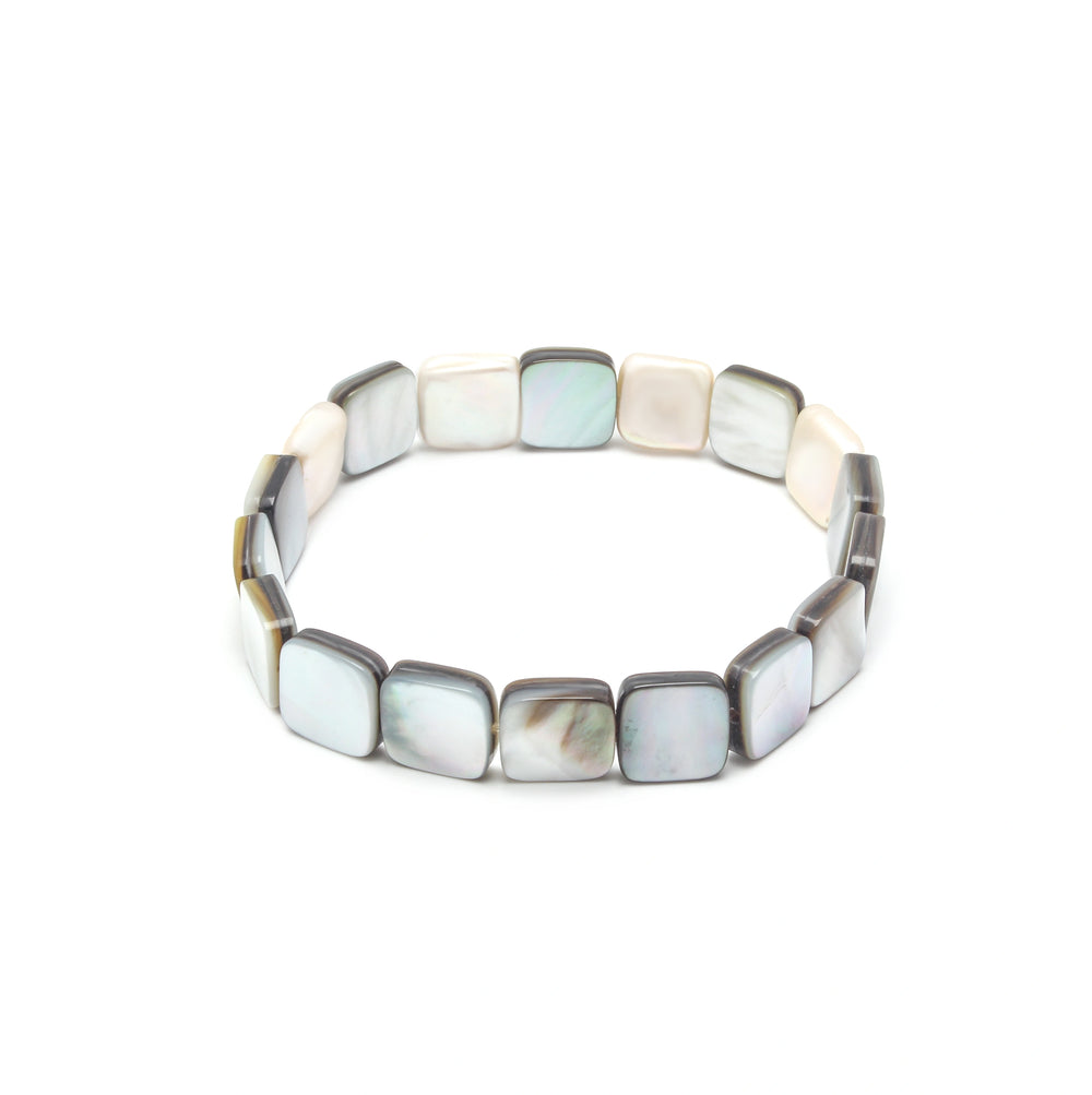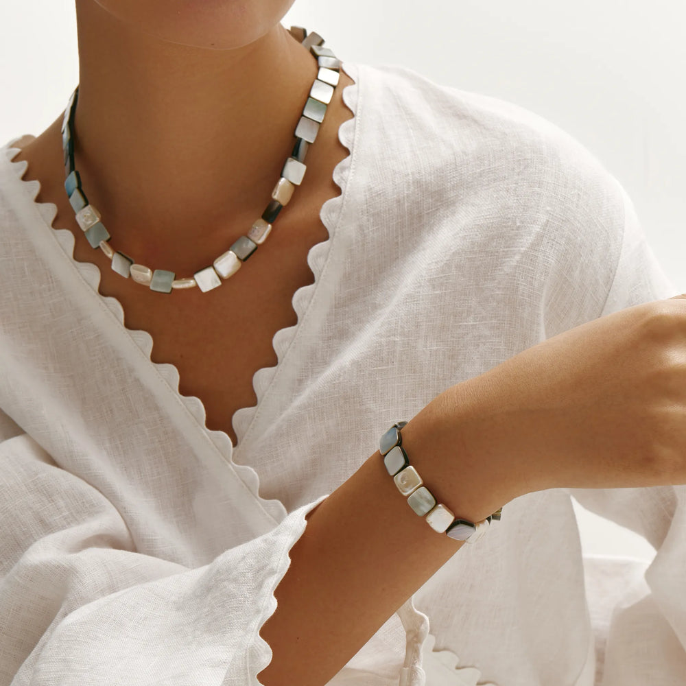 The Aurelia Bracelet evokes the calm rhythm of the sea. Iridescent square shell beads form a harmonious pattern, each reflecting light with quiet elegance. Symbolizing balance and fluidity, it is a reminder of nature’s serene beauty. Designed for effortless versatility, it elevates both casual and refined looks with understated charm.