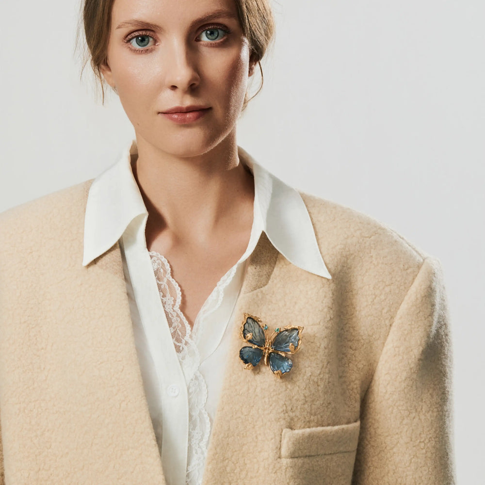 The Aurelia Butterfly Brooch captures the quiet miracle of transformation — a moment when fragility turns to strength and transparency reveals beauty. Carved glass wings shimmer like morning light, framed in golden edges that echo nature’s finest details. Wear it as a reminder: becoming takes time, but when you rise, you rise luminous.