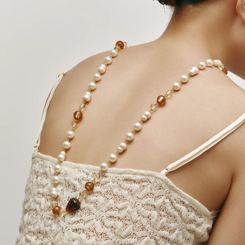 The Aurelia Long Necklace is designed to capture light and warmth. Hand-strung with luminous pearls and amber-toned crystals, it balances timeless refinement with a golden glow of modern elegance. Wear it long for an elongated silhouette, or double it up for layered sophistication—crafted to bring effortless versatility to every.