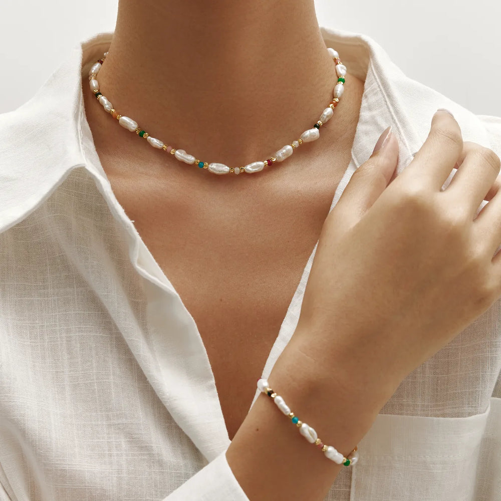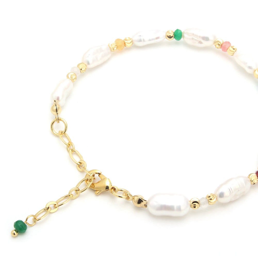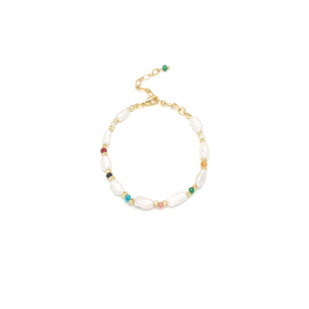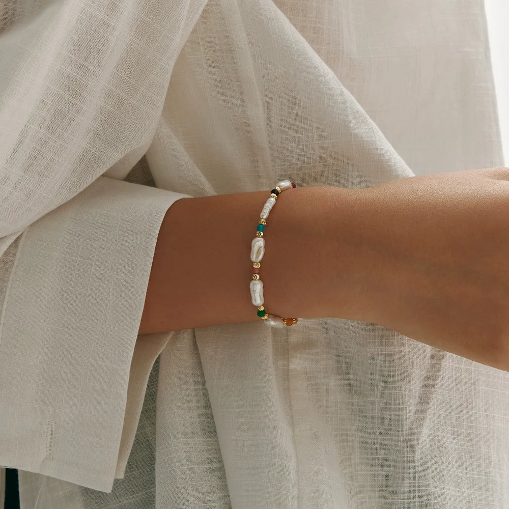 The Celeste Bracelet is a celebration of color and charm. Irregular freshwater pearls are interspersed with vibrant beads, creating a piece that feels both playful and refined. Designed to brighten everyday styling, it’s a bracelet that captures joy, elegance, and the art of effortless layering.