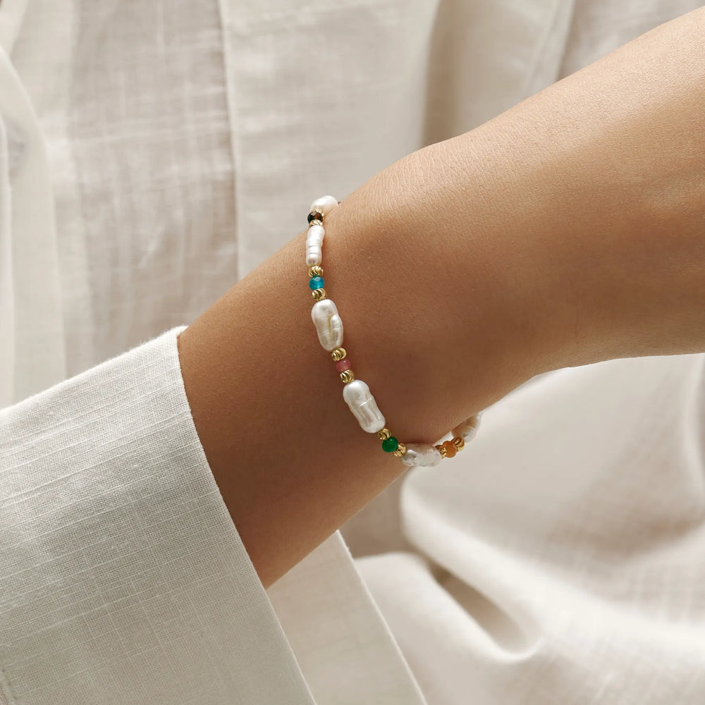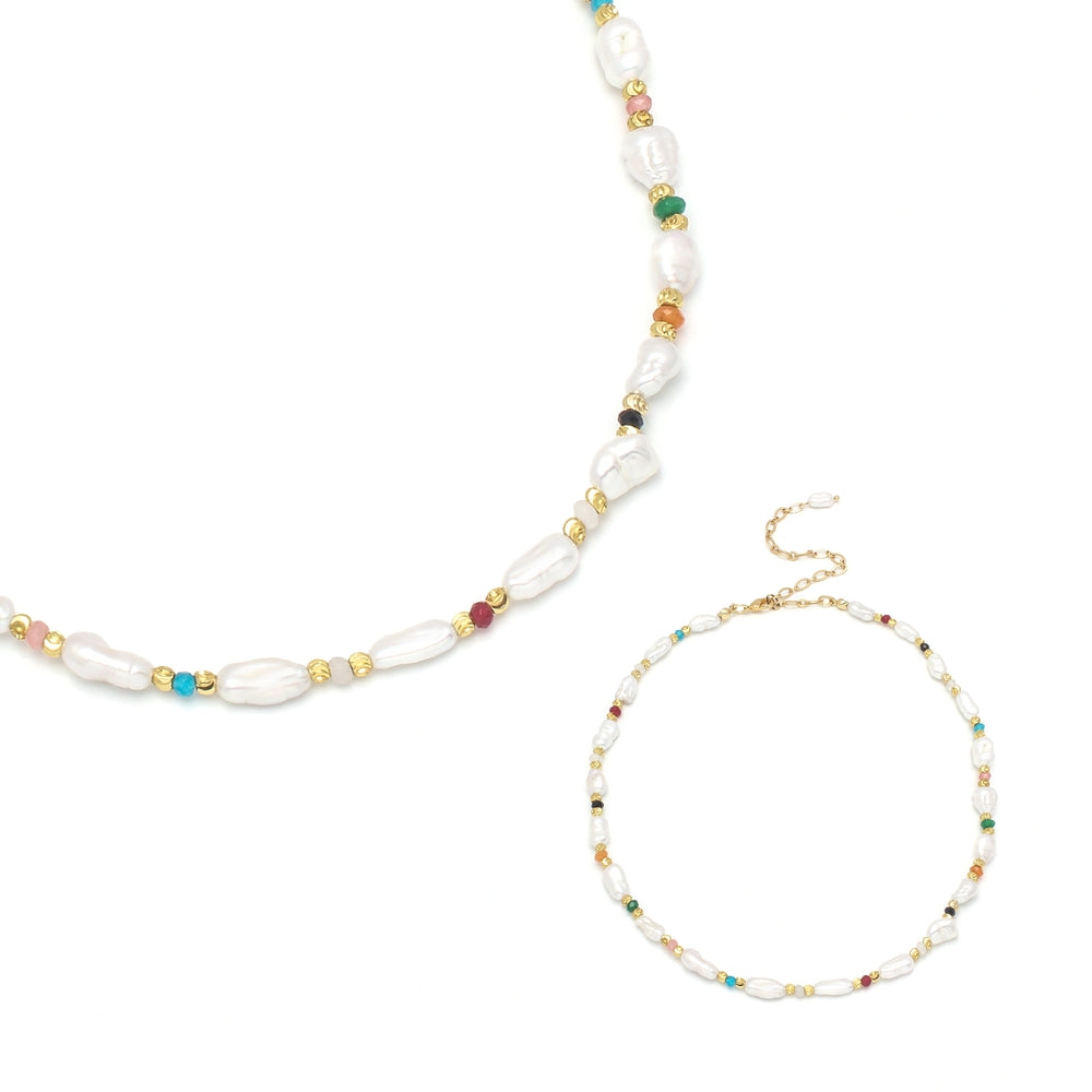 The Celeste Set celebrates versatility and color. Featuring two necklaces—one strung with freshwater pearls and the other with vibrant multicolor beads—it offers endless styling options. Wear them layered for a playful, textured look, or separately for understated elegance. Designed to brighten everyday wear, the set captures both charm and individuality in a harmonious duo.