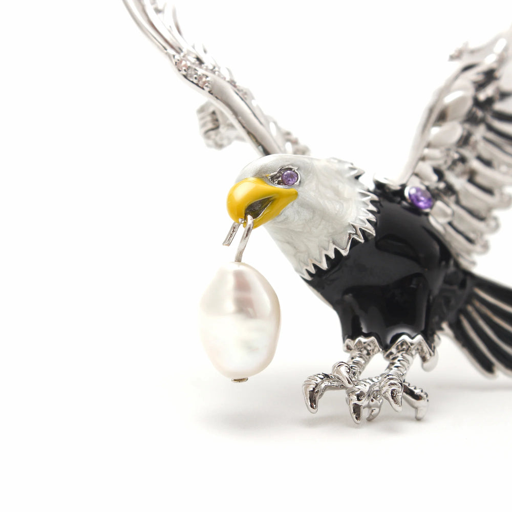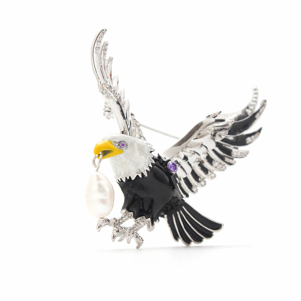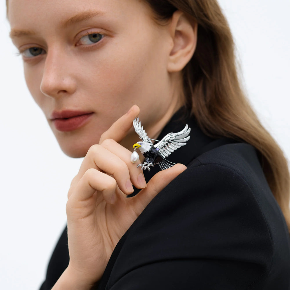 The moment before the sky opens. The Celestial Eagle Brooch captures the instinctive rise of the eagle as it lifts into the air, wings spread wide and eyes fixed beyond the horizon. In its beak, a luminous pearl becomes a symbol of something worth protecting, carrying, and bringing forward into the future. The eagle has long stood for vision, courage, and guardianship. It does not move without purpose. It rises because it knows where it is going. Rendered in radiant gold tone with sculpted wings and a suspended pearl drop, this piece balances strength with quiet elegance. A talisman for those who trust their direction and carry what matters most with them.