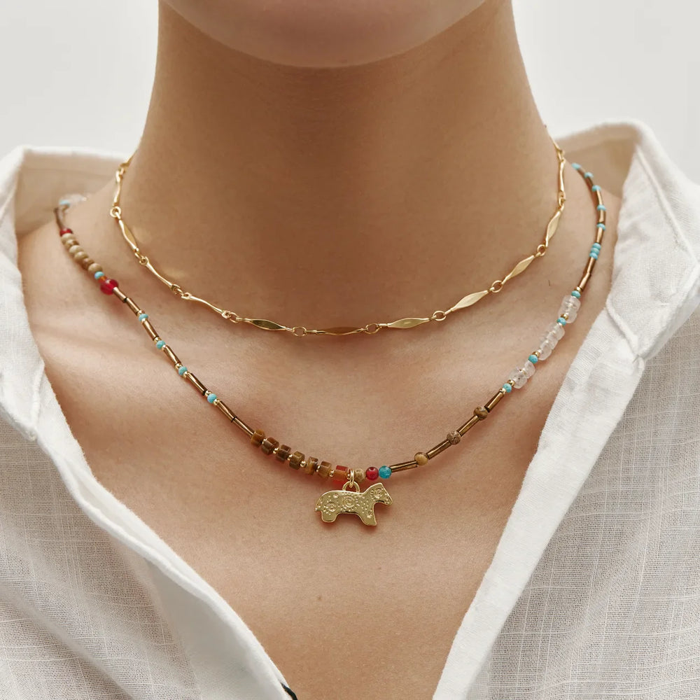 The Equus Set captures the spirit of playful layering. Featuring a beaded horse charm necklace paired with a sleek gold-tone choker, the set blends whimsy with elegance. Designed for versatile styling, it can be worn together for a bold layered look or separately for subtle charm, making it a perfect duo for expressing individuality and effortless sophistication.