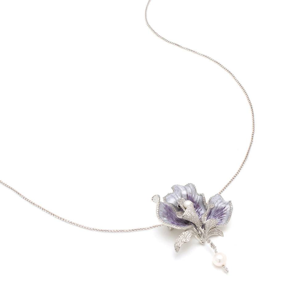The Lilium Moon Brooch evokes the quiet radiance of moonlit petals opening in the stillness of night. Frost-tinted purples bloom into soft silver light, adorned with crystalline accents and a single pearl — a symbol of purity, devotion, and grace that rises above time. Wear it as a whisper of serenity and an ode to hearts that bloom softly, yet remarkably.