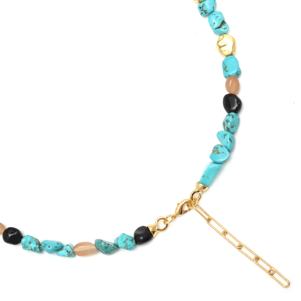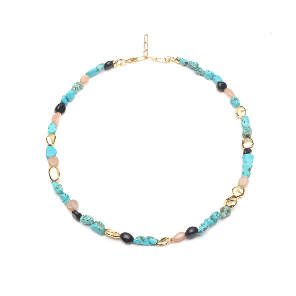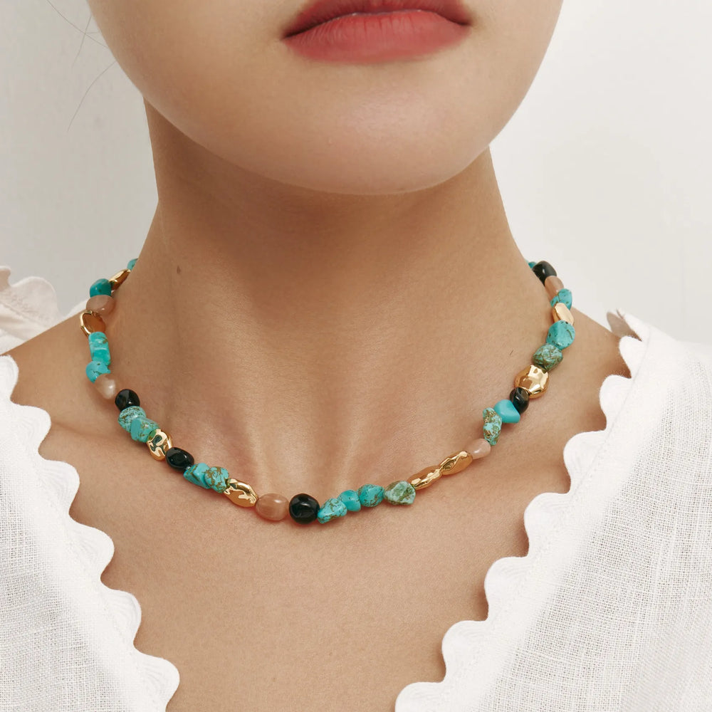 The Maris Necklace is inspired by the colors of the sea—vivid turquoise, deep green, and radiant gold. Each gemstone is hand-strung to highlight its natural shape, creating a design that feels organic yet elevated. Perfect for bringing a touch of vacation mood into everyday life, this necklace embodies effortless chic and timeless elegance.