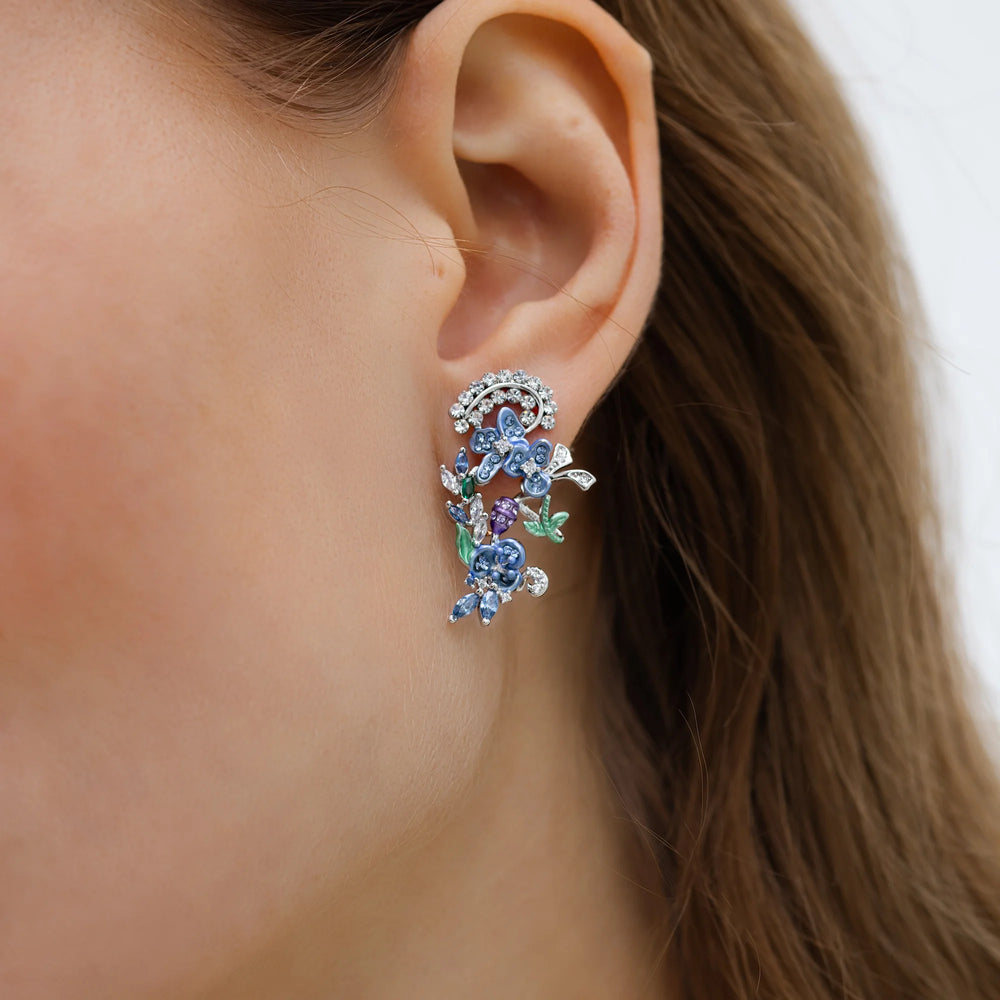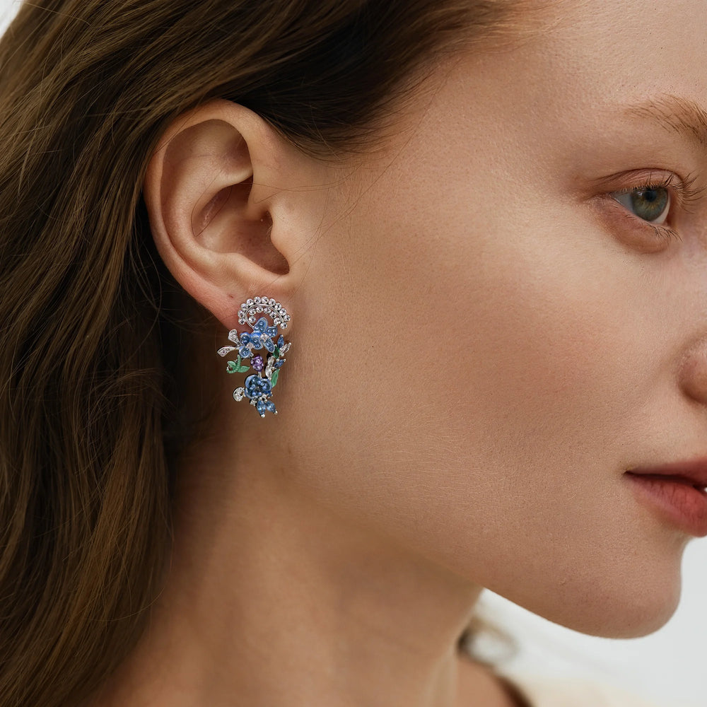 A garden at first light. Soft petals still holding the morning dew. The Morning Dew Garden Drop Earrings capture the freshness of dawn through cool blue blossoms, tiny leaves and crystal droplets that shimmer like water under sunlight. A halo of stones frames the ear, while the floral cascade falls gently below, creating movement with every step. Light, dreamy and quietly luminous. A piece that feels like wearing a moment of morning.
