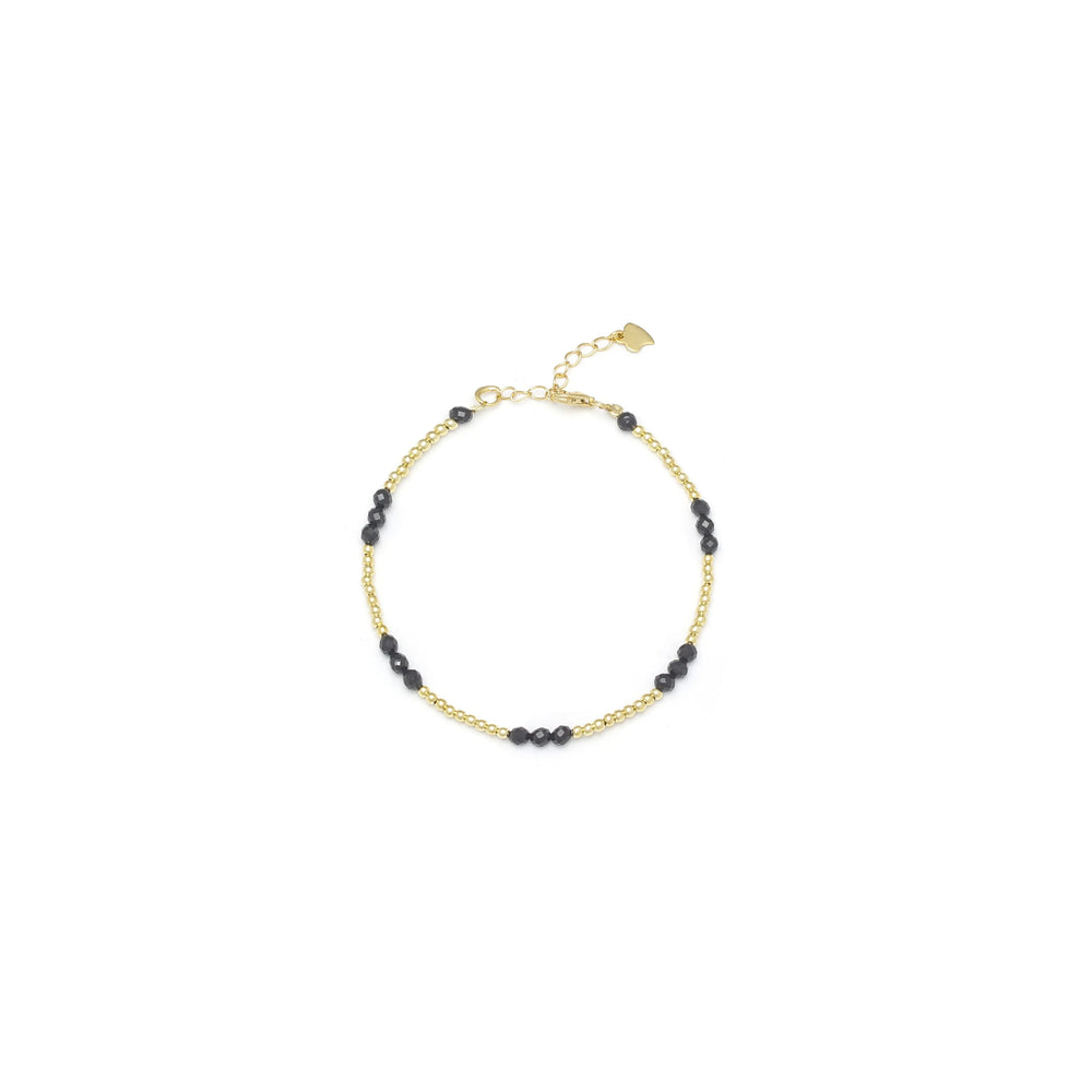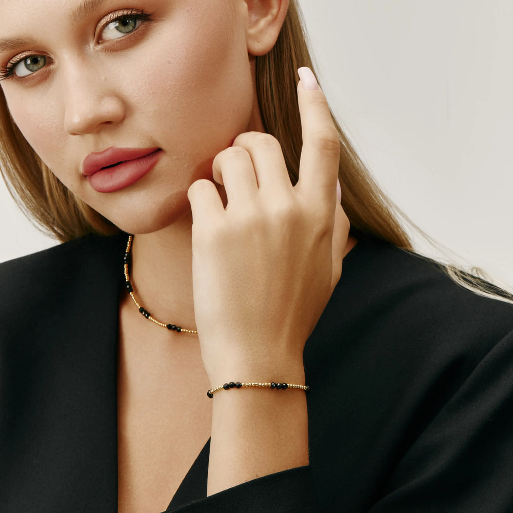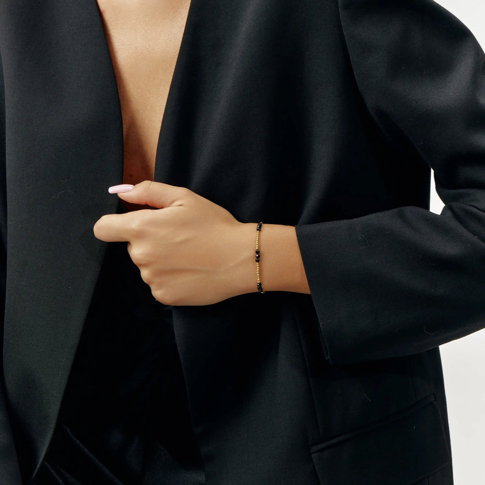 The Noir Bracelet captures understated elegance with a modern edge. Featuring delicate black beads woven through a polished gold-tone chain, it adds a refined contrast that elevates everyday styling. Designed for versatility, it can be stacked with other bracelets or worn solo for a minimalist statement — a timeless piece that transitions effortlessly from day to night.