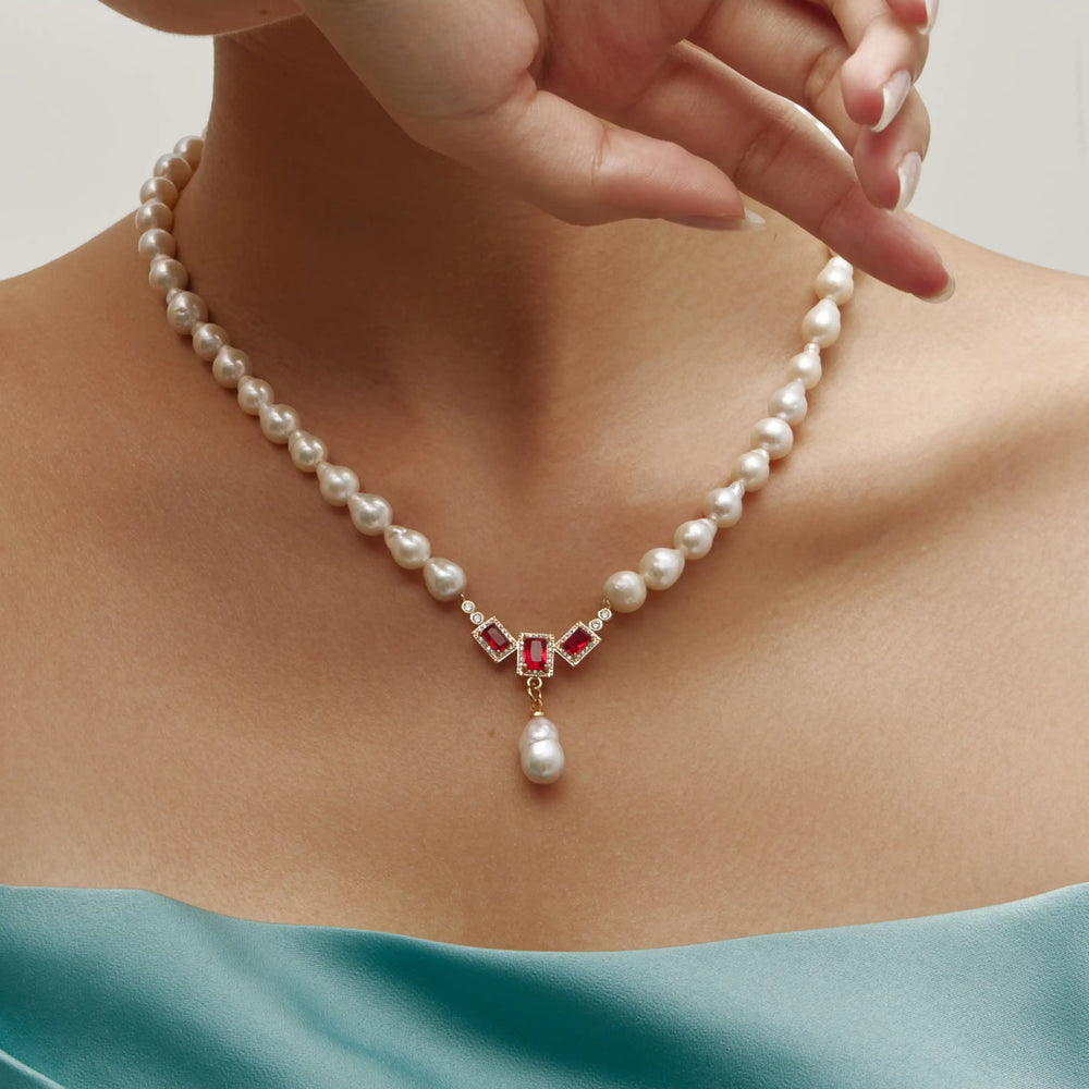 The Regalia Necklace channels the spirit of timeless grandeur. Hand-strung with radiant freshwater pearls, it features a striking centerpiece of red baguette-cut gemstones, crowned with a luminous baroque pearl drop. Designed for those who embrace elegance with strength, this necklace is a statement of regal beauty and modern refinement.
