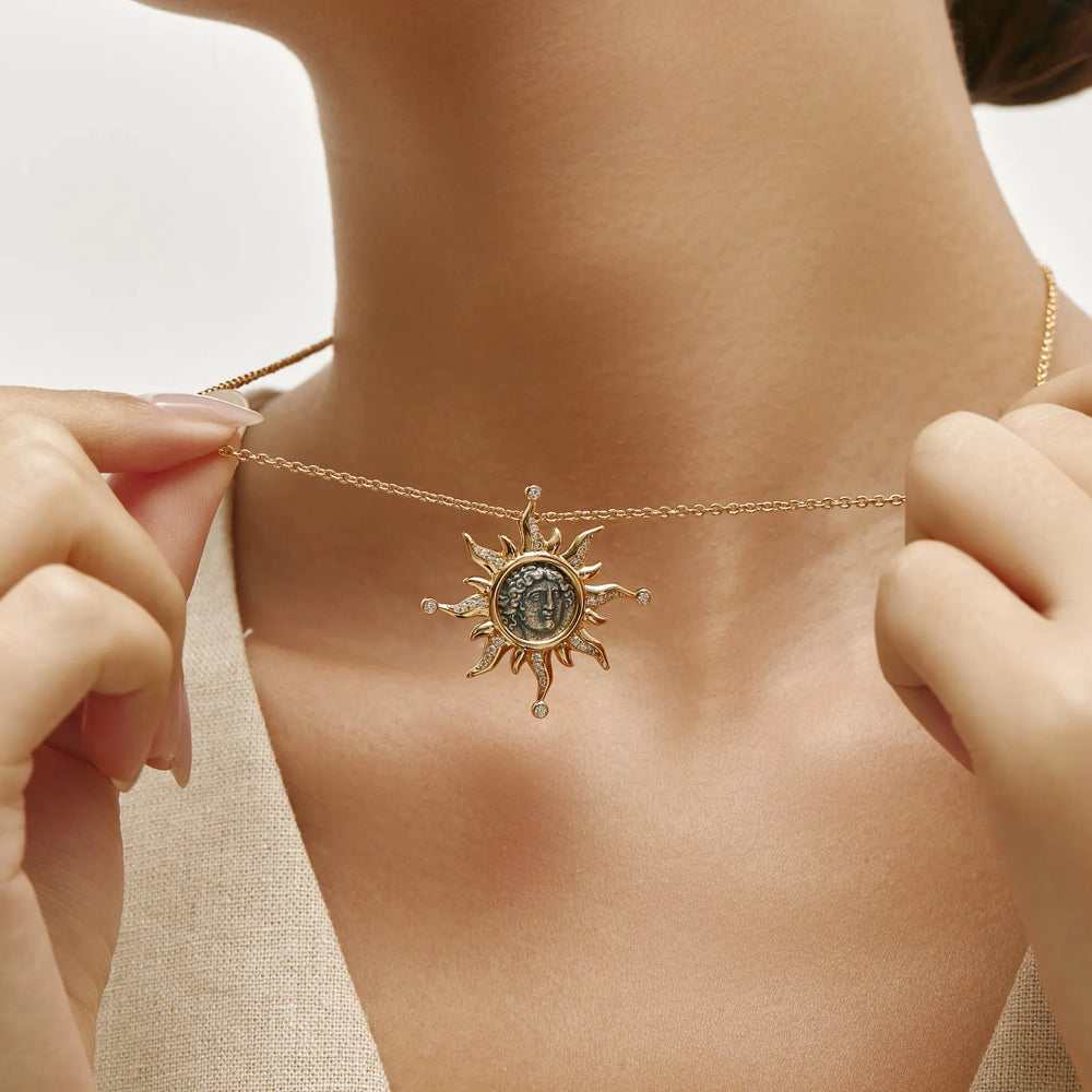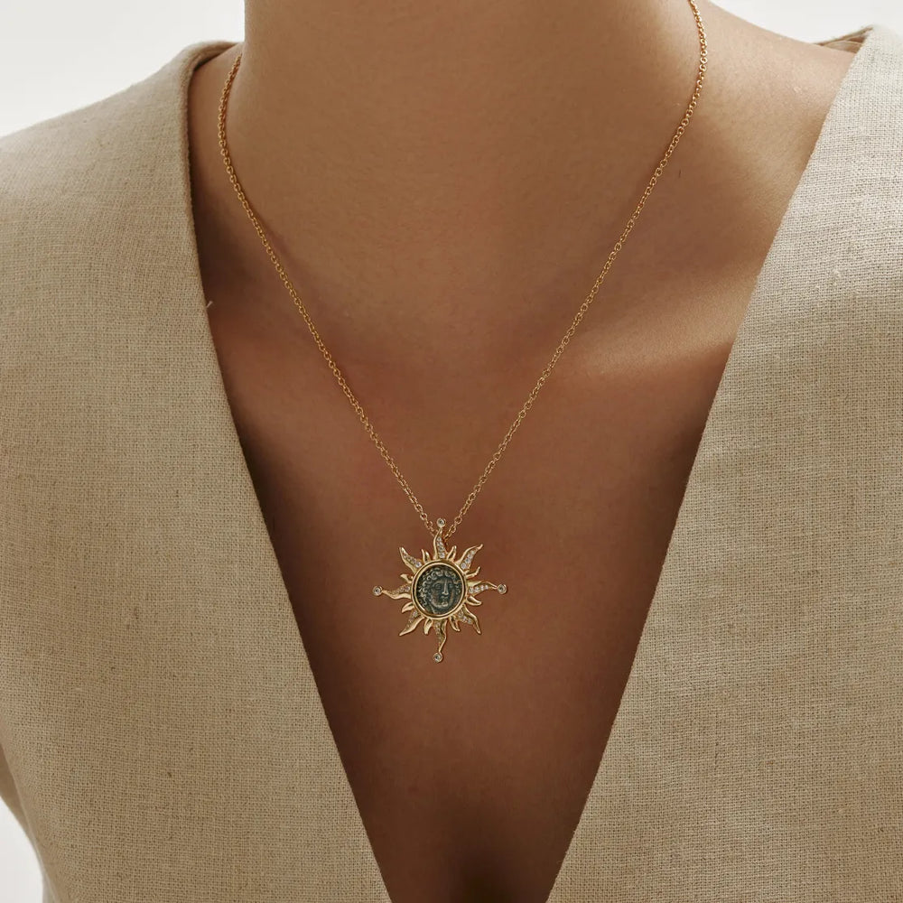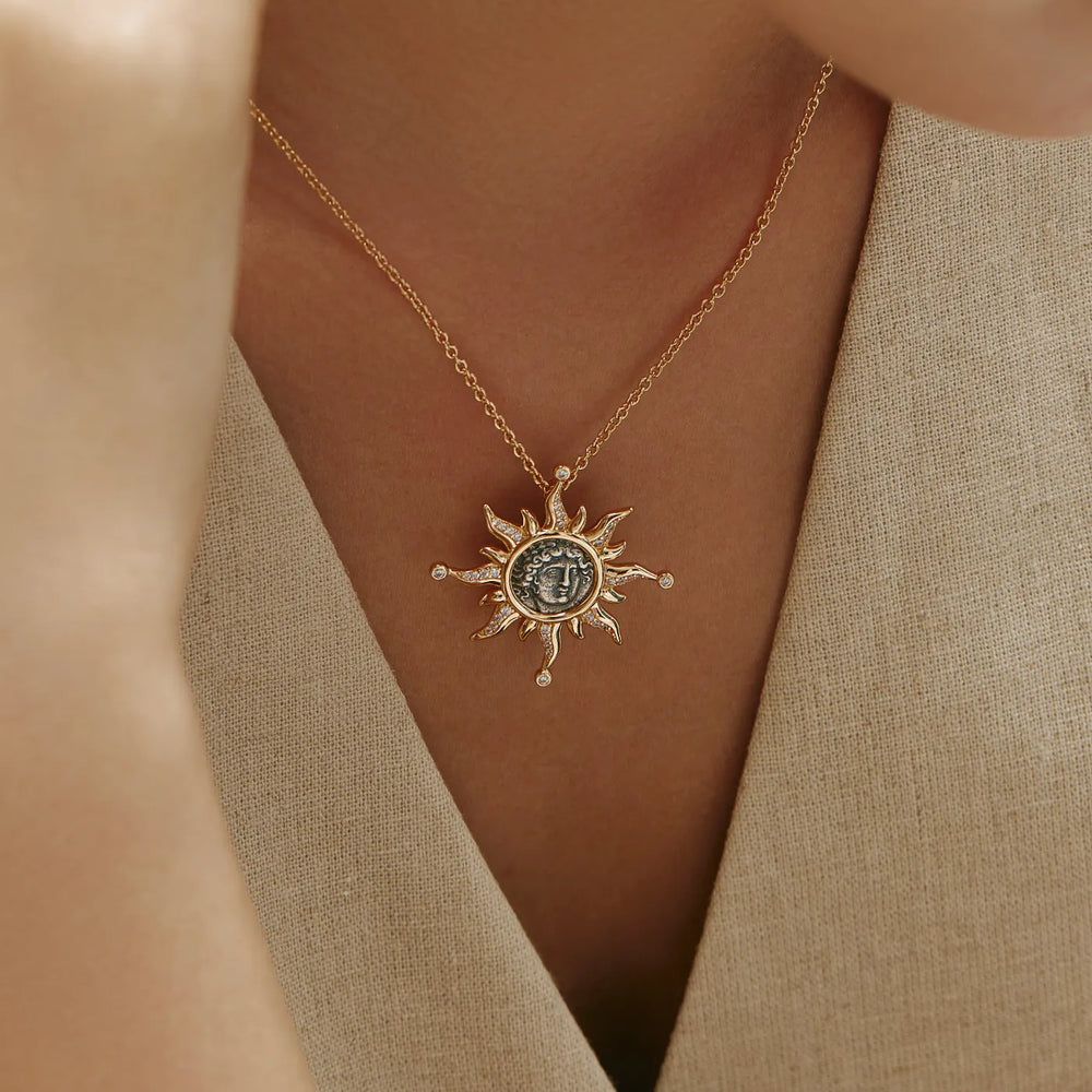 The Solis Necklace channels the enduring power of the sun. A radiant medallion, detailed with sculpted artistry, hangs from a refined gold Vermeil chain. More than jewelry, it is a symbol of light and strength—a timeless piece that empowers your everyday elegance.