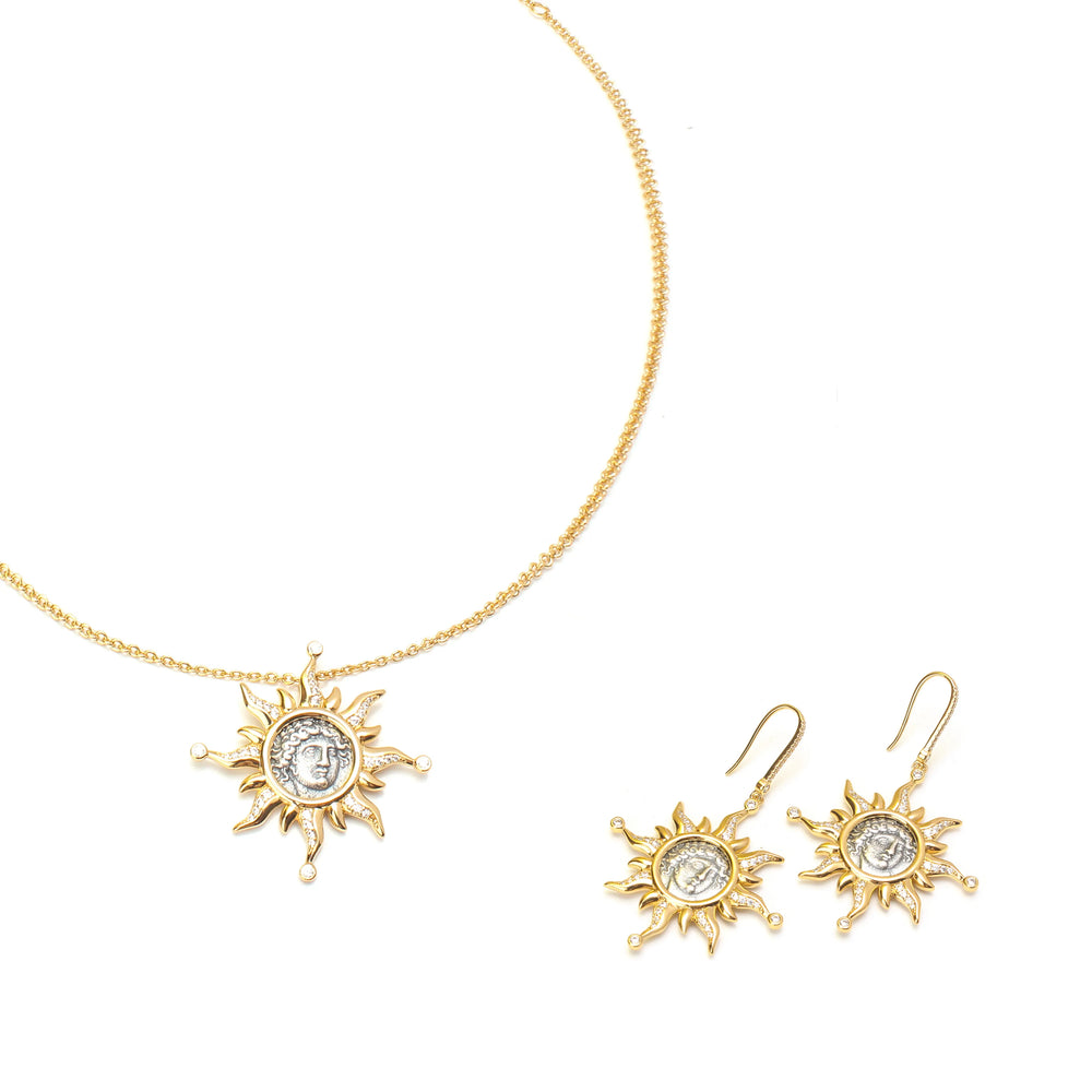 The Solis Set radiates timeless strength and luminous beauty. Featuring a sunburst medallion design, this matching necklace and earring set embodies power, vitality, and elegance in perfect harmony. With its intricate detailing and dual-tone brilliance, it’s more than adornment—it’s a symbol of light carried close to you, ready to illuminate both everyday and special moments.