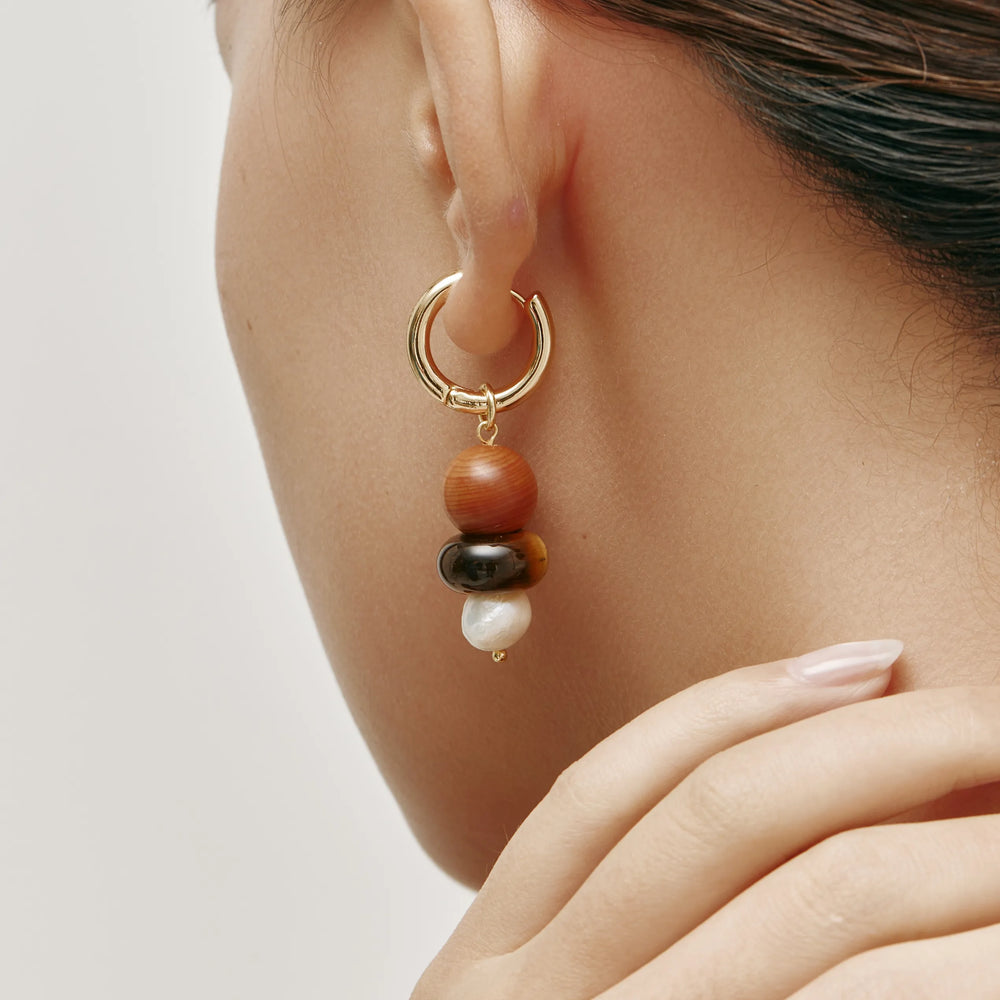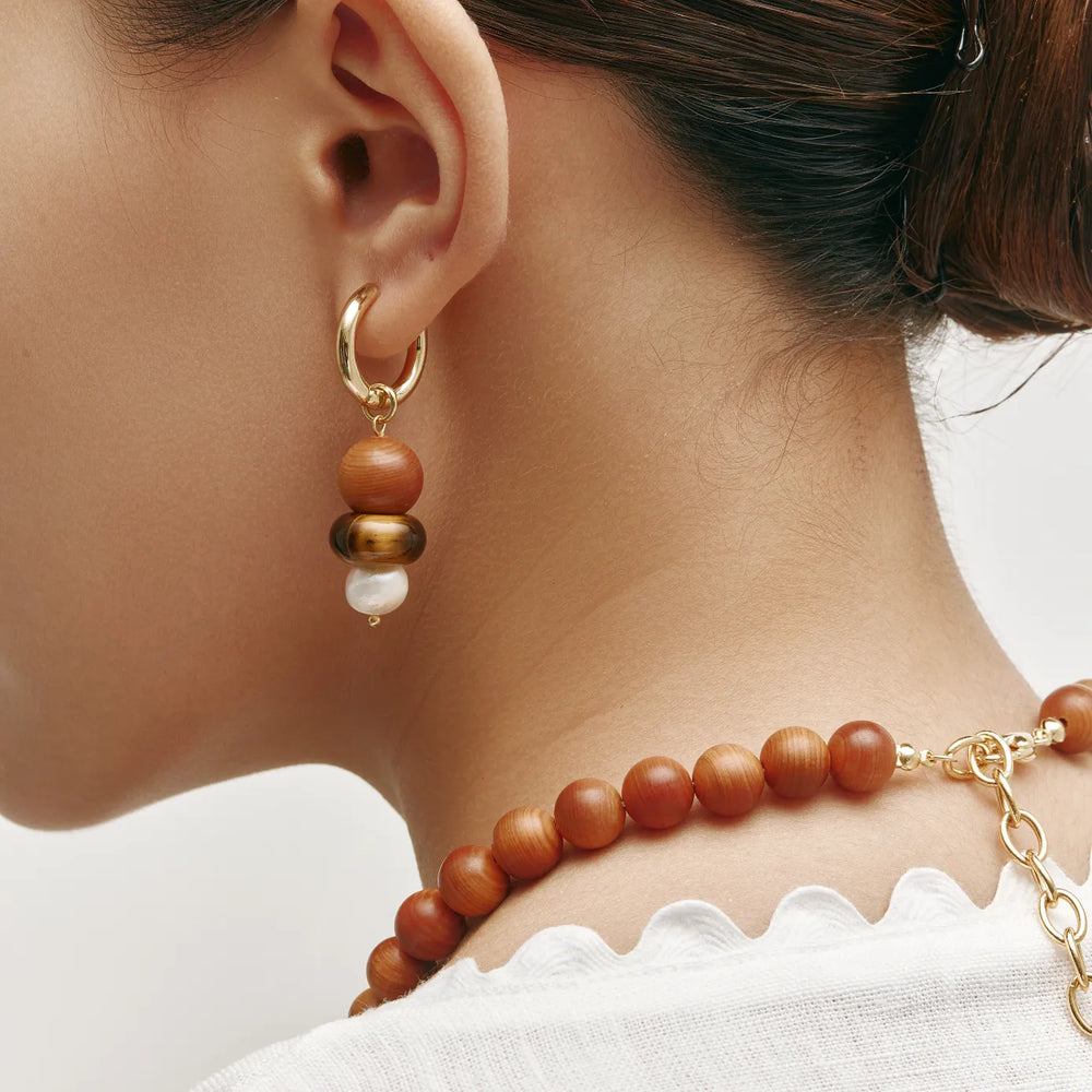 The Sylva Earrings embody the dialogue between nature’s textures and timeless elegance. With the grounding warmth of wood, the iridescence of shell, and the purity of freshwater pearls, they echo the balance of earth and sea. Designed as everyday armor with subtle sophistication, these earrings elevate your style with organic charm.