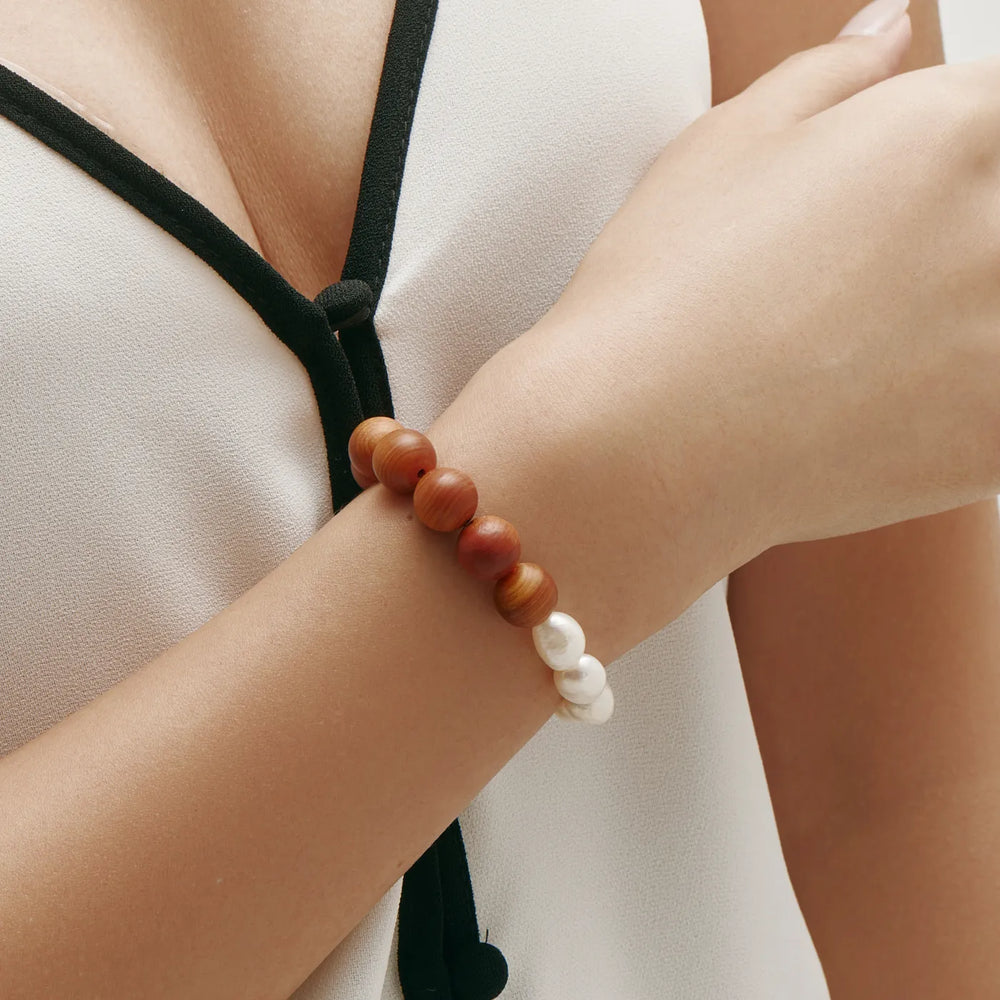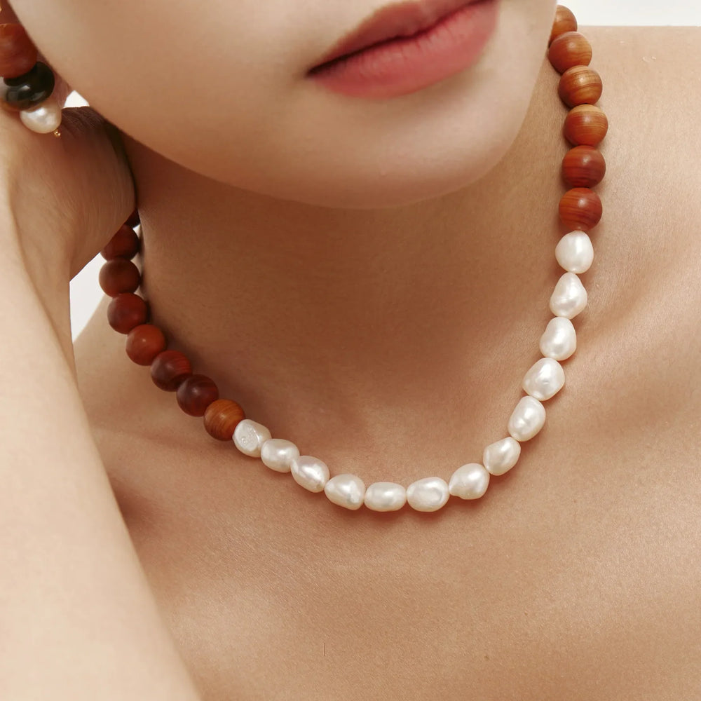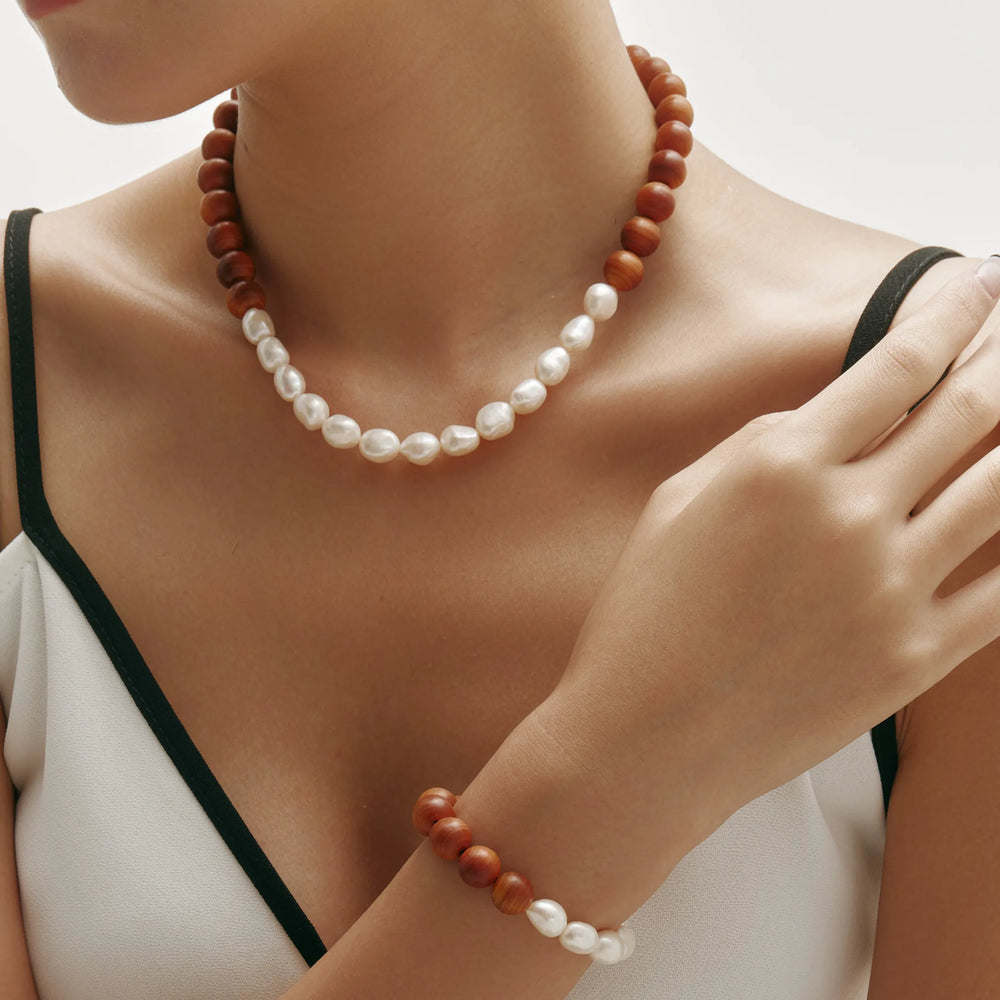 The Sylva Set is a complete expression of organic harmony. Featuring a necklace, bracelet, and earrings, it combines earthy wood with luminous pearls and shell details, offering a versatile and cohesive style statement. Thoughtfully crafted, it’s a set that celebrates balance, warmth, and effortless elegance.