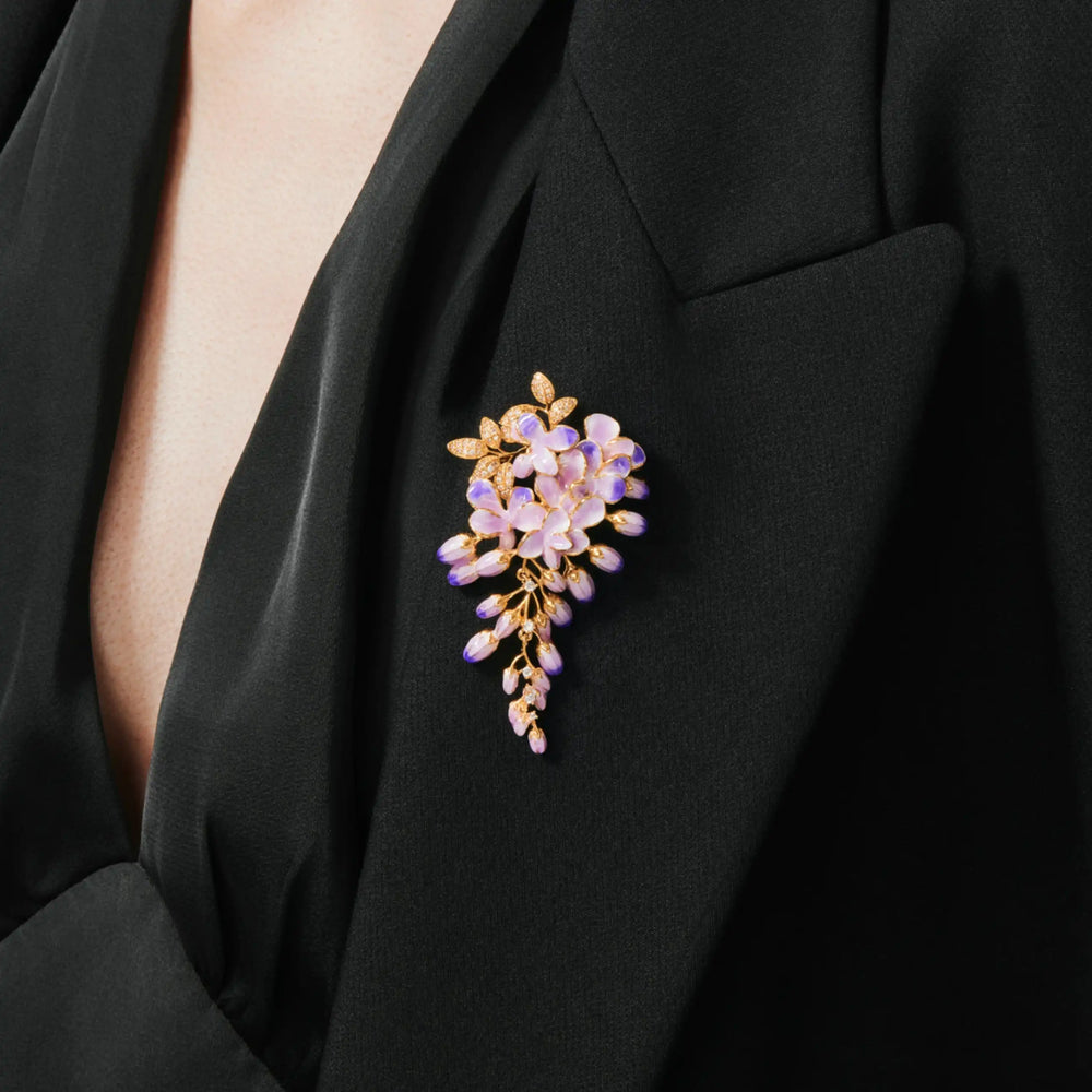 The Wisteria Dream Brooch captures the quiet grace of blossoms that drape like poetry in motion. Soft purple petals unfold in gentle gradients, kissed by golden vines and crystal dew — a symbol of tender longing, enduring hope, and love that grows with patience. Wear it as a whisper of romance and a reminder: the most beautiful things bloom in their own time.